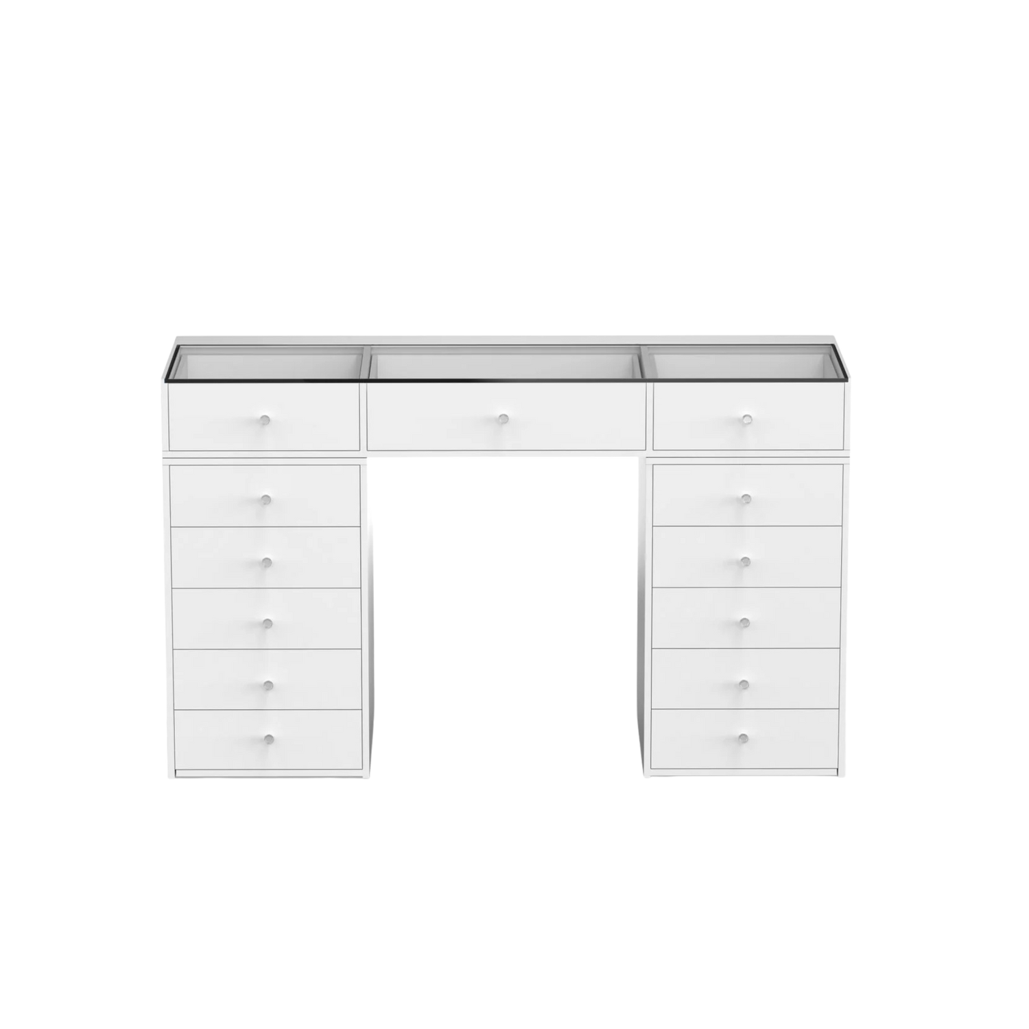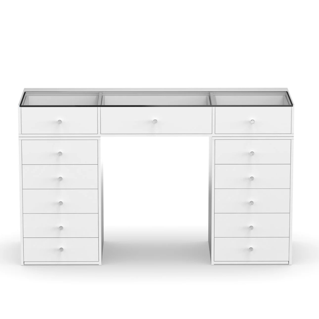 Une coiffeuse élégamment conçue avec des compartiments ingénieux pour garder tous vos essentiels parfaitement organisés et à portée de main.